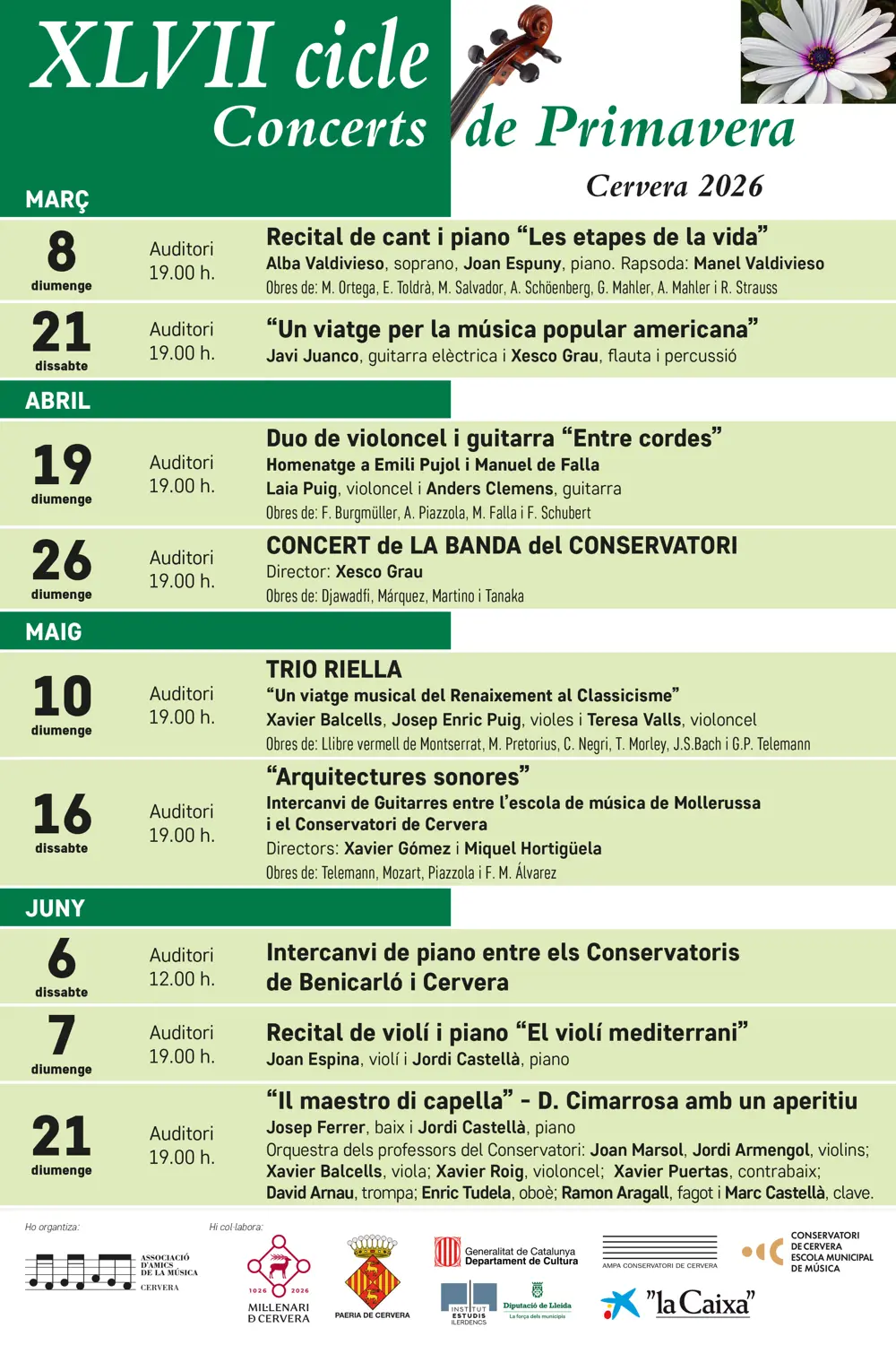 Spring hosts some of the most popular and traditional festivals of the year, including that dedicated to Sant Jordi (Saint George), and Holy Week, which is a period in which the territory becomes a flood of processions, gatherings, caramelles (religious songs) and other religious activities. The Passion of Christ of Cervera deserves its own special mention; more than 300 secondary actors take part in this truly unique spectacle.